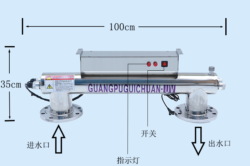 接通电源后指示灯亮,确保灯头和灯管连接正常,防尘罩盖上然后点按“电源开关”按钮灯管指示灯亮,累时器转动,等待3-5秒灯管点亮,此时设备正常运行当确认灯管亮3-5分钟后,先打出水阀门、后打开进水阀门,这时本机器开始运行。
